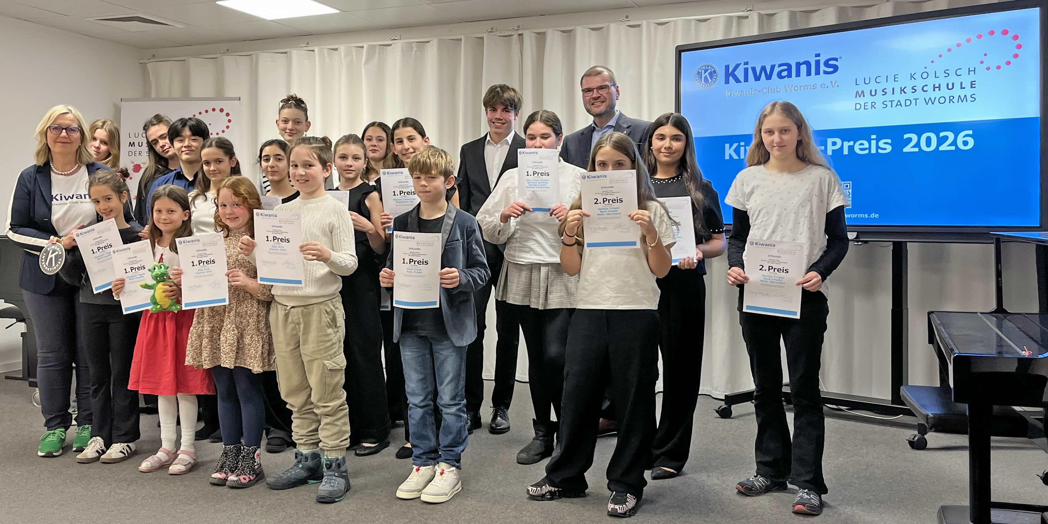 Bereits zum zehnten Mal fand am vergangenen 7. März 2026 der Kiwanis-Preis, der Förderpreiswettbewerb für die Lucie-Kölsch-Musikschule der Stadt Worms, statt. Vormittags stellten sich 22 junge Musikerinnen und Musiker in neun Ensembles dem Urteil der Jury. Am Abend präsentierten die Teilnehmer Auszüge aus ihrem Wettbewerbsprogramm, bevor sie von Dr. Angela Scheugenpflug, der Präsidentin des Kiwanis-Clubs Worms, und Musikschulleiter Wolfgang Neidhöfer ihre Urkunden und Geldpreise erhielten.